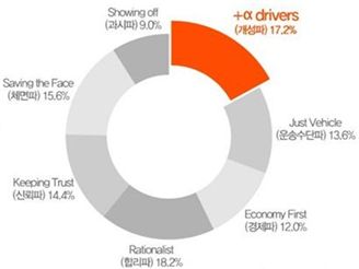 이노션이 분석한 자동차 소비자의 유형은 운송수단파, 경제파, 합리파, 신뢰파, 체면파, 과시파, 개성파 등 7가지로 나뉘며, 그 중 개성파가 +α드라이버에 해당된다. 전체에서 +α드라이버가 차지하는 비율은 17.2%로 합리적인 계산을 통해 자동차를 구매하는 합리파(18.2%)에 이어 두번째로 많은 소비자들이 속해 있었다. 보고서는 +α드라이버가 특정 연령이나 소득수준에 국한 되지 않고, 다양한 소비층에서 나타난다고 분석했다. 이어 이들이 새로운 시장 가치를 이끌어내고 자신만의 방식으로 삶을 주도해 가기 때문에 미래 자동차 시장을 주도할 가능성이 크다고 강조했다.▲ +α드라이버의 7가지 소비코드 (자료 이노션)