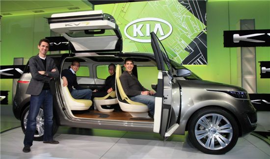 [아시아경제 김혜원 기자] 기아자동차가 개성 넘치는 미니밴 콘셉트카 'KV7'을 자동차의 수도 디트로이트에서 공개했다.기아차는 10일(현지시간) 미국 디트로이트 코보센터에서 열린 '2011 북미국제오토쇼(이하 디트로이트 모터쇼)에서 신개념 미니밴 콘셉트카 KV7을 세계 최초로 공개했다.KV7은 ‘현대적 감각과 활동성을 갖춘 미니밴(modern day activity van)’을 컨셉으로, 미니밴의 실용성과 SUV의 스포티함을 결합한 신개념 미니밴 콘셉트카다.기아차가 쏘울에 이어 두 번째로 선보이는 박스 스타일의 디자인으로, 웅장한 전면부 디자인에 패밀리룩 라디에이터 그릴을 장착해 강렬한 이미지와 첨단 스마트폰을 연상시키는 매끄럽고 세련된 실루엣을 선보였다.KV7의 가장 큰 특징은 2열의 걸윙 도어(gull-wing door, 도어가 위로 열리는 방식)다.미니밴에는 세계 최초로 시도된 걸윙 도어는 기존 차량과 달리 B 필러가 없어, 깔끔하고 넓은 실내 공간을 제공한다.또한 운전석과 조수석, 좌측 후석 시트 등 4개의 시트를 원하는 방향으로 회전할 수 있어 다양한 용도에 따라 시트를 활용할 수 있도록 해 편의성을 향상시켰다.우측 뒷좌석에는 벤치 스타일의 3인승 좌석과 미니 테이블이 구비돼 있어 작은 미니바가 설치된 느낌을 준다.KV7