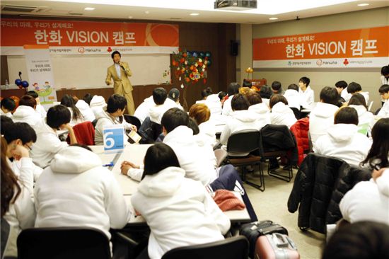 한화는 ‘우리의 미래, 우리가 설계해요’라는 주제로 고등학교 졸업과 동시에 사회복지시설을 퇴소해 자립해야하는 청소년들이 자신감을 갖고 사회에 나서기 위해 프로그램을 준비했다고 설명했다.올해는 검정고시를 통해 10년만에 대학에 진학하고, 4수 끝에 개그맨이된 고혜성씨의 특강이 청소년들의 관심을 끌었다. 참가한 청소년들은 고씨의 특강을 통해 포기하지 않는 꿈의 소중함과 자신감을 갖게 됐다고 전했다.비전캠프는 지난해 8월부터 해마다 진행하고 있다. 한화는 이 밖에도 저소득층 청소년들이 IT·미용·기술 등 분야에서 자격증을 취득할 수 있도록 하는 저소득층 청소년 자립기반 지원 프로그램도 2009년부터 이어가고 있다.▲ 개그맨 고혜성씨가 11일 부터 강원도 평창 한화리조트에서 열린 '한화 비전 캠프'에서 '꿈을 이룬 사람의 이야기'라는 주제로 특강을 진행했다. 사진은 특강을 마치고 참가 고등학생들이 10년 뒤 소망을 적은 것을 공개하며 파이팅을 외치는 모습.