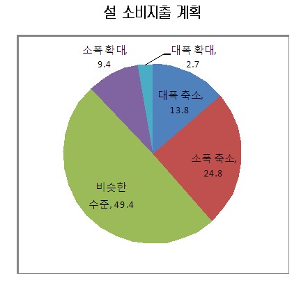 13일 대한상공회의소(회장 손경식)가 최근 서울경기지역 630명의 주부를 대상으로 실시한 '2011년 설 소비계획 조사' 결과에 따르면, 조사대상의 49.4%가 '올해 지출규모는 작년과 비슷할 것'이라고 답했고, 38.6%는 '축소할 것'이라고 응답했다. '확대할 것'은 12.0%에 불과했다.설 소비를 축소하겠다고 응답한 주부들은 축소 이유로 '물가상승 등에 의한 실질소득 감소'(41.2%)를 가장 많이 꼽았으며, '경기불안 지속'(28.0%)과 '가계부채 부담'(23.0%)을 차례로 꼽았다. 반면 소비를 확대하겠다고 응답한 주부들은 확대 이유로 '경기회복에 대한 기대'(31.6%)와 '물가상승 때문에 불가피하게'(28.9%)를 가장 많이 꼽았다.실제 작년 설 경기와 비교한 올해 설 체감경기를 묻는 질문에 조사대상의 70.2%가 '지난해보다 악화됐다'('크게 악화' 34.3%, '약간 악화' 35.9%)고 응답했으며, '작년과 비슷하다'는 응답은 26.5%였다.