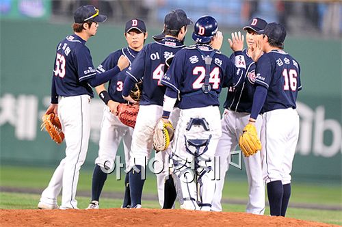 2010 프로야구 롯데와 준플레이오프 4차전을 승리한 두산 선수들이 기뻐하고 있다.