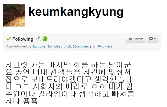 [스포츠투데이 조범자 기자]연예계 스타들도 '시크릿가든' 종영에 아쉬움을 드러냈다.SBS 주말드라마 '시크릿가든' 16일 오후 20회로 막을 내린 가운데 '시크릿 열병'을 앓았던 스타들도 일반 대중들과 똑같은 시원섭섭함을 느꼈다.가수 윤도현은 이날 자신의 트위터에 "편곡하랴 시가보랴 난리~"라고 멘션을 올린 뒤 드라마가 끝나자 "끝났다. 오스카는 쉬스곤이라도 부를기세였음 ㅋㅋ 잘봤습니다. 자 이제 편곡마무리 ~ 일욜밤 잘보내세요^^"라며 '시크릿가든'을 보냈다. 김제동은 "시크릿 가든 마지막 회를 하는 날이군요 공연 내내 관객들을 시간에 맞춰서 집으로 보내드려야겠다고 생각했습니다 ㅋㅋ 사회자의 배려로 ㅎㅎ 내가 김주원이다 길라임이다 생각하고 빠져봅시다 흠흠"이라고 했고, 오스카(윤상현 분)가 부른 '눈물자리' 작사를 맡은 가수 김범수는 "마라도에서 막회를 시청하게 될 줄이야..ㅋㅋ 눈물자리를 모니터하게 될 줄이야~^_^* "라고 멘션을 올렸다.가수 김창렬은 "이제 시크릿가든 끝나서 남편들 주말에 다 돌아다녔네 ㅋㅋㅋ 암튼 좀 아쉬운 결말인거 같았음 ^^ 내생각이니 머라하지 마샘 ㅎ"이라며 "내 타임라인의 90%가 시가얘기 ㅋㅋㅋ 주말에 미친존재감 시가의 여운 얼마나갈까?? 울 마누라도 친한동생이랑 거실에서 시가 되새김질 ㅋㅋㅋ"라며 아쉬움을 드러냈다. '시크릿가든'은 방영내내 최고의 화제를 뿌리면서 가수 보아와 시크릿, 박한별, 박경림 등이 '시가 폐인' '주원앓이'를 자처할 만큼 큰 인기를 모았다. 심지어 아시안컵 축구대회에 출전하고 있는 축구 대표팀 선수들까지 '시크릿가든' 종영에 큰 아쉬움을 표해 '국민드라마'로 화려한 자리매김을 했다.스포츠투데이 조범자 기자 anju1015@<ⓒ아시아경제 & 재밌는 뉴스, 즐거운 하루 "스포츠투데이(stoo.com)">