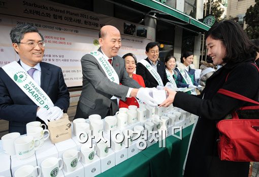 [아시아경제 윤동주 기자] 스타벅스코리아는 18일 서울 강남구 삼성역사거리점에서 '그린스타트, 그린 스토어-일회용 컵 없는 매장' 캠페인을 갖고 있다. 행사에 참석한 이만의 환경부 장관이 머그컵을 사용하자는 의미로 시민들에게 머그컵을 나눠주고 있다. 스타벅스코리아는 25일부터 전국 50개매장에서 고객들이 음료를 주문하면 별도의 요청이 없는 이상 모든 음료를 머그컵에 제공한다.윤동주 기자 doso7@<ⓒ세계를 보는 창 경제를 보는 눈, 아시아경제(www.asiae.co.kr) 무단전재 배포금지>