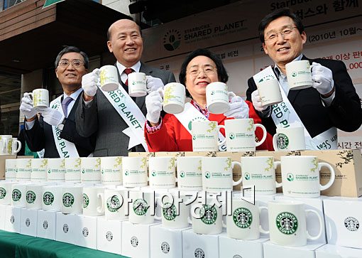 [아시아경제 윤동주 기자] 스타벅스코리아는 18일 서울 강남구 삼성역사거리점에서 '그린스타트, 그린 스토어-일회용 컵 없는 매장' 캠페인을 갖고 있다. 행사에 참석한 이진 그린스타트 전국네트워크 공동대표(왼쪽부터), 이만의 환경부 장관, 김재옥 자원순환사회연대 대표, 이석구 스타벅스코리아 사장이 머그컵을 사용하자는 의미의 퍼포먼스를 하고 있다. 스타벅스코리아는 25일부터 전국 50개매장에서 고객들이 음료를 주문하면 별도의 요청이 없는 이상 모든 음료를 머그컵에 제공한다.윤동주 기자 doso7@<ⓒ세계를 보는 창 경제를 보는 눈, 아시아경제(www.asiae.co.kr) 무단전재 배포금지>