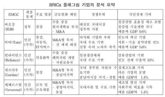 박 연구원은 “EMGC 플래그십 기업도 자원 관련 기업이 대부분”이라며 “수출보다는 자원, 기술, 시장 확보를 위해 기존의 해외 기업을 M&A한다”고 밝혔다. 인도의 타타그룹, 멕시코의 세멕스 등을 그 예로 꼽았다.