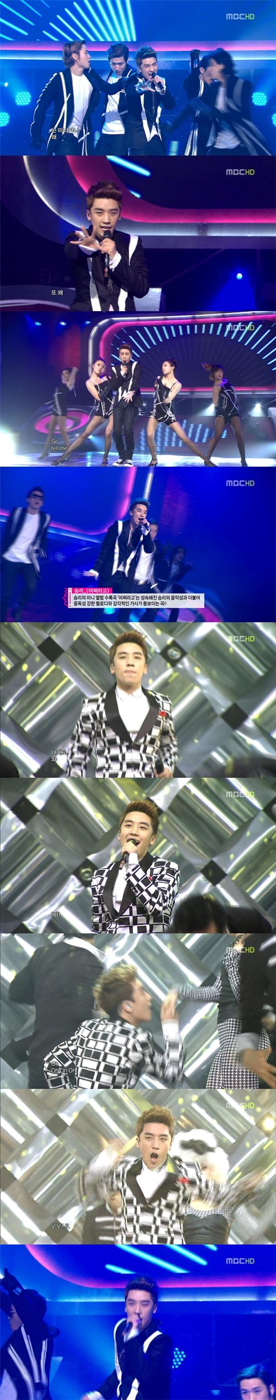[스포츠투데이 최준용 기자]빅뱅 승리가 남성적인 이미지로 탈바꿈해 화려한 컴백 무대를 선사했다.승리는 22일 생방송으로 진행된 MBC '쇼!음악중심'에 출연해 첫 솔로앨범 수록곡 'VVIP' '어쩌라고'를 공개했다.이날 무대에서 승리는 자신만의 독특한 음악적 색깔과 남성적인 이미지로 시선을 사로잡았다. 또 승리는 한층 성숙한 가창력과 화려한 안무로 보는 이들의 감탄을 자아냈다.타이틀 곡 중 하나인 'VVIP'는 자신의 세상에 빠져보라는 유혹의 메시지를 담은 곡으로 화려한 브라스 사운드와 전자 사운드가 절묘하게 조합된 댄스곡이다. 또 복고적이면서도 화려한 뮤지컬의 느낌을 살려내 마치 라스베이거스 쇼를 보는 듯한 이미지를 전한다.'어쩌라고'는 믿었던 연인이 자신을 배신하고 떠난 것에 대한 허탈함을 표현한 곡으로 승리가 처음 작사·작곡에 참여한 데 이어 직접 안무까지 짰다. 이와 함께 이번 앨범에는 아이유가 함께한 '아이 노우(I KNOW)'를 비롯해 '화이트 러브(WHITE LOVE)' '창문을 열어' 등을 수록했다. 승리는 앨범 발매에 앞서 자신의 미투데이를 통해 "이번 솔로 미니앨범 준비 정말 죽을 각오로 했다"며 "빅뱅 멤버들, 회사식구들에게 절대 부끄럽지 않은 모습을 약속하겠다"라며 남다른 각오를 전했다.스포츠투데이 최준용 기자 yjchoi01@<ⓒ아시아경제 & 재밌는 뉴스, 즐거운 하루 "스포츠투데이(stoo.com)">