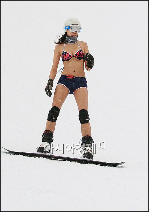 [무주(전북) = 스포츠투데이 박성기 기자] 22일 오전 11시 전라북도 무주군 설천면 무주리조트 만선 베이스 루키힐 슬로프에서 개최된 '2011 Mujuresort Bikini Ski Festival(2011 무주리조트 비키니 페스티벌)'에서 모델이 설원을 질주하고 있다.