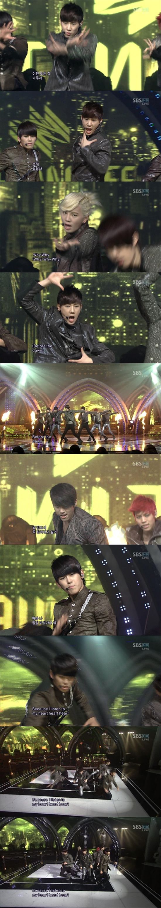 [스포츠투데이 최준용 기자]남성 7인조 그룹 인피니트가 더욱 향상된 군무로 눈길을 사로잡았다. 인피니트는 22일 생방송으로 진행된 MBC '쇼!음악중심'에 출연해 두 번째 미니앨범 '에볼루션(EVOLUTION)'의 타이틀 곡 'B.T.D'를 공개했다.이날 무대에서 인피니트 멤버들은 파격적인 머리 염색과 강렬한 무대의상으로 한층 성숙한 분위기를 보여줬다. 아울러 1집 때와는 다른 파워풀한 보컬과 강렬한 안무로 순수한 소년에서 거친 남자로의 변신에 성공했다.여기에 인피니트는 한달 동안 피땀 흘려 연습했다는 전갈춤을 완벽하게 소화해냈다. 이날 인피니트는 한 치에 어긋나지 않은 완벽한 대형과 동작으로 군무 아이돌의 진면목을 보여줬다.이번 음반 타이틀곡 'B.T.D'는 '비포 더 던(BEFORE THE DAWN)'의 약자로 카라의 '미스터', '프리티걸' 레인보우의 'A' 등을 작업한 한재호-김승수 콤비가 심혈을 기울인 곡이다.또 여심을 뒤흔들 가사와 함께 어쿠스틱 악기와 전자악기가 하나로 믹스된 사운드가 어우러져, 비장함과 드라마틱한 느낌의 정점을 표현해냈다.인피니트의 이번 음반에는 타이틀 곡 'B.T.D'외에도 '인트로'와 감성적 인 팝 댄스 넘버 '캔 유 스마일(CAN U SMILE)', 강렬한 리듬이 인상적인 'Hysterie' , 엠씨 더 맥스의 제이윤이 작곡한 명품 발라드 '마음으로.. (Voice of my heart)', 마지막 트랙 '몰라' 등 총 6곡이 수록돼 있다.스포츠투데이 최준용 기자 yjchoi01@<ⓒ아시아경제 & 재밌는 뉴스, 즐거운 하루 "스포츠투데이(stoo.com)">