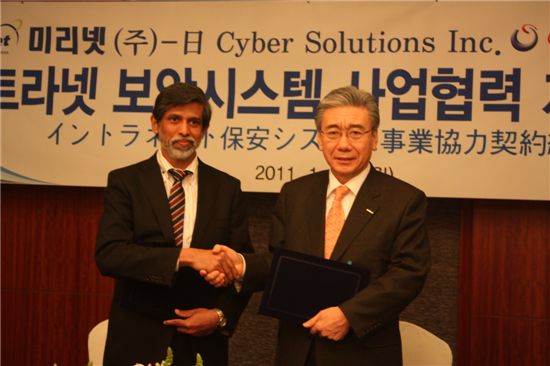 이상철 미리넷 회장(오른쪽)과 글렌 맨스필드 키니 사이버솔루션 CEO가 보안사업협력 조인식 후 기념촬영하고 있다.