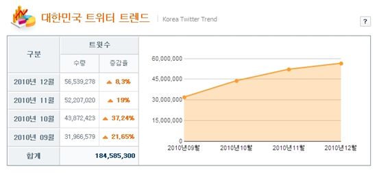 트윗트렌드는 수집한 한글 트윗을 바탕으로 다양한 통계 자료를 제공한다.