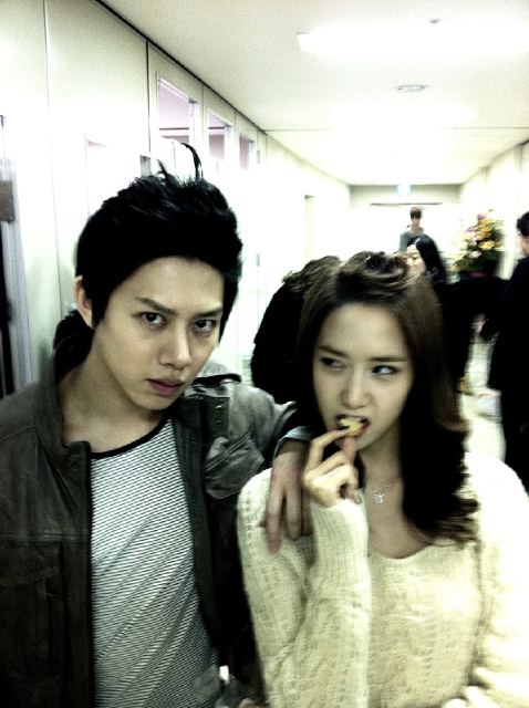 Super Junior member Heechul posted a picture of himself with Girls' Generation member Yoona on his official Twitter account (//twitter.com/Heedictator) today. In the uploaded photograph, Heechul is seen wearing a leather jacket with a serious expression on his face and one hand on Yoona's shoulder, while Yoona is biting into a biscuit with a sly look on her face with a comment below saying, "The concept for Yoona and I today is gangster. I don't know whether to post the video or not because it's funny to see us being childish (laugh)" Heechul also re-posted a past picture he took with Yoona in which they are both touching their lips with their index finger. Fans who have seen both pictures left responses such as, "The two of you look great and Yoona looks so pretty without makeup!" "Both of you look scary like real gangsters!" and "You two make a good couple!" Heechul first started out in the entertainment business with a role in KBS' teenage drama "Sharp 2" in 2005 and then began his singing career as one of the members his popular boy band which has remained one of the most popular K-pop acts in Asia. Yoona made her debut in the nine-member female idol group Girls' Generation in 2007. Outside of her group activities, she has starred TV dramas "You are Destiny (KBS, 2008)" and "Cinderella Man (MBC, 2009)."Super Junior member Heechul and Yoona of Girls' Generation [Heechul's official Twitter website] <br /> <br />