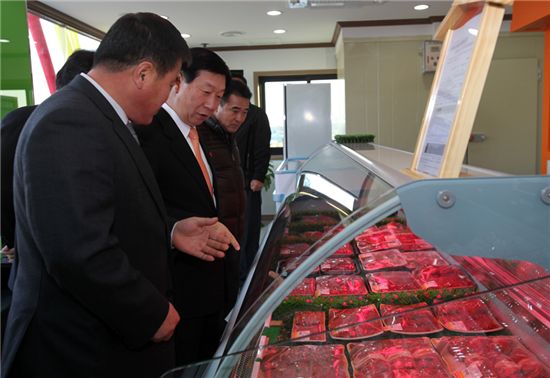 매장에 놓인 '서산우리한우'를 돌아보고 있는 유상곤 서산시장(왼쪽에서 두번째) 등 관계자들.