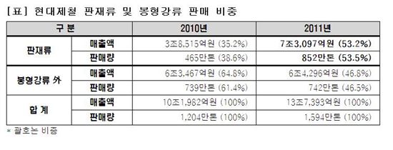 매출 10조원···2008년 이후 두 번째 최고 성과2011년 1594만t, 매출 13.7조원···전년비 30% 이상 신장사상 처음으로 판재류 비중이 봉형강류 보다 커져