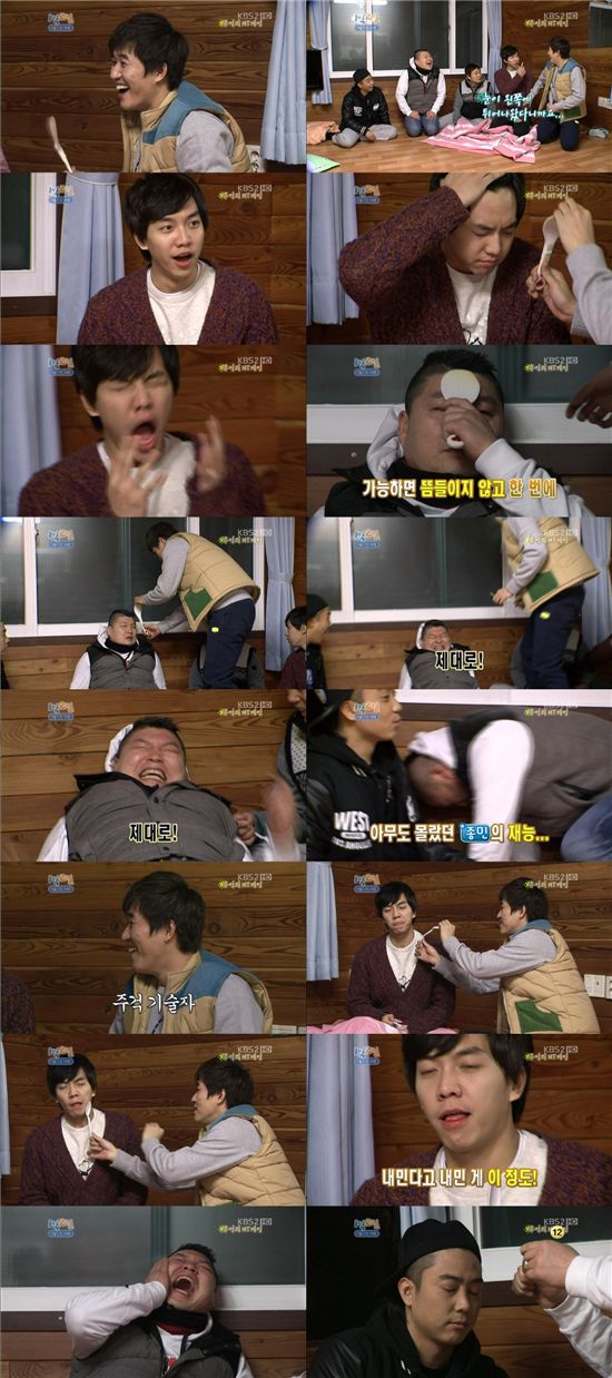[스포츠투데이 최준용 기자]김종민이 일명 ‘주걱기술자’라고 명명된 애칭을 얻으며 예능감을 끌어올렸다. 30일 방송된 KBS2 예능프로그램 '해피선데이-1박2일'(이하 1박2일)에서는 산장여행 제2탄이 공개된다.이날 멤버들은 저녁 복불 복 전에 막간을 이용해 추억의 MT게임을 펼치게 됐다. 007빵을 종목(?)으로 정해놓고 멤버들은 긴장감 넘치는 게임을 진행해 갔다. 처음에 멤버들은 조그만 스푼으로 이마 때리는 벌칙을 행했다. 하지만 점점 분위기가 고조되며 멤버들은 결국 주걱으로 볼과 이마를 맞게 됐다.이날 김종민은 마음이 약한 나머지 차마 벌칙을 수행하지 못하는 멤버들을 대신해 주걱을 손에 잡았다. 그는 과감한 주걱 때리기로 '주걱기술자‘라는 호칭을 얻게 됐다.특히 이승기는 김종민의 주걱에 맞고 “아! 정말 눈이 튀어나올 것 같다”고 말해 주변을 웃음 바다로 만들었다.이에 강호동은 ‘가학 논란’을 염두한 것인지 “저희는 웃자고 하는 게임인데 시청자 여러분들도 그냥 게임이라고 생각하시고 웃어주세요”라고 말해 눈길을 끌었다. 한편 이날 다섯 멤버는 산장여행에 걸맞게 진수성찬으로 펼쳐진 바비큐 요리를 획득하기 위해 버라이어티한 복불복 게임쇼를 벌이며 웃음을 선사했다. 스포츠투데이 최준용 기자 yjchoi01@<ⓒ아시아경제 & 재밌는 뉴스, 즐거운 하루 "스포츠투데이(stoo.com)">