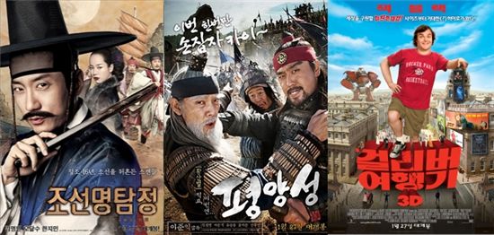 [스포츠투데이 고경석 기자]코미디 영화가 설 연휴를 앞두고 극장가를 장악했다.김명민 주연의 코믹 추리극 '조선명탐정: 각시투구꽃의 비밀'(이하 '조선명탐정')과 잭 블랙 주연의 코믹 어드벤처 '걸리버여행기', 이준익 감독의 풍자극 '평양성'이 나란히 주말 흥행 1~3위에 오르며 상위권을 장악했다. 31일 영화진흥위원회 영화관입장권 통합전산망에 따르면 27일 개봉한 '조선명탐정'은 주말 사흘간(28~30일) 62만 1110명을 모아 누적 관객수 73만 4020명으로 주말 흥행 1위에 올랐다. '조선명탐정'은 조선 정조 시대를 배경으로 공납비리를 수사하라는 밀명을 받고 관료들의 뒤를 파헤치는 명탐정의 활약상을 그렸다. 김명민 외에 오달수 한지민 등이 출연했다.이 영화는 김명민의 코믹 변신으로 화제를 모았다. 실력은 뛰어나지만 쩨쩨하고 비겁하며 뻔뻔한 허당 캐릭터를 잘 소화해 주말 극장가를 폭소로 들썩이게 했다. 김명민과 콤비로 출연한 코믹 조연 오달수의 활약상도 높은 평가를 받았다.같은 날 개봉한 할리우드 코미디 '걸리버 여행기'는 같은 기간 47만 5194명(누계 56만 621명)로 2위에 올랐고 이준익 감독의 '평양성'은 32만 1644명(누계 38만 9202명)으로 3위를 차지했다. '걸리버 여행기'는 친숙한 원작소설을 최신 컴퓨터그래픽 기술과 결합해 설 연휴를 앞두고 극장가에서 좋은 반응을 얻고 있다. 짐 캐리에 이어 할리우드 대표 코미디 배우로 자리매김하고 있는 잭 블랙의 활약이 돋보인다는 평을 받고 있다. 잭 블랙은 '스쿨 오브 락' '로맨틱 할리데이' '킹콩' 그리고 애니메이션 '쿵푸 팬더'의 목소리 연기 등을 통해 국내에도 많은 팬을 확보하고 있다.이준익 감독의 역사 풍자극 '평양성'은 8년 전 개봉한 '황산벌'의 속편으로 감독 특유의 풍자와 해학이 가득한 작품이다. 정진영 이문식이 전편에 이어 다시 출연했고 류승룡 윤제문 선우선 이광수 등이 새롭게 가세했다. '조선명탐정' '걸리버 여행기' '평양성'이 5일간 이어지는 황금 연휴인 설 극장가에서 어떤 결과를 낳을지 주목된다. 스포츠투데이 고경석 기자 kave@<ⓒ아시아경제 & 재밌는 뉴스, 즐거운 하루 "스포츠투데이(stoo.com)">