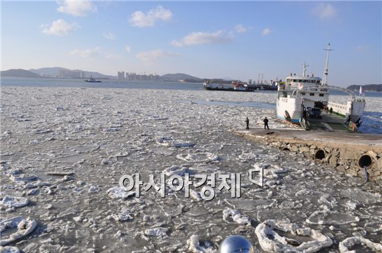 지난 30일 인천 월미도 앞바다에 얼음덩어리가 몰려들어 여객선의 통행을 방해하고 있다.