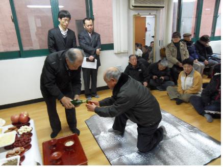 돈의동 쪽방상담소에서 쪽방촌 주민들이 공동차례를 지내는 모습.<br />