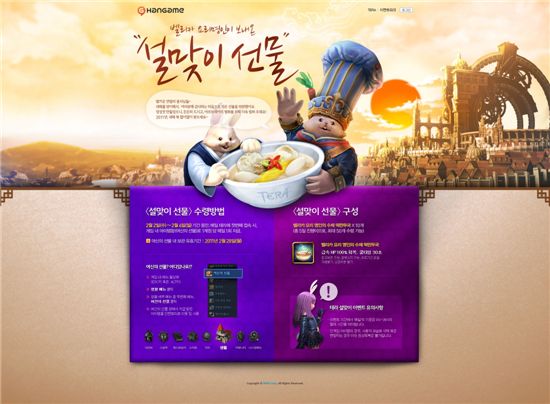 우선 NHN이 운영하는 게임포털 '한게임'은 설을 맞아 최근 인기를 끌고 있는 다중접속역할수행게임(MMORPG) '테라' 등에서 다양한 이벤트를 마련했다. 오는 6일까지 '테라'에 접속한 모든 사용자들은 아이템을 받을 수 있고 새롭게 추가된 게임 콘텐츠도 즐길 수 있다. 액션 역할수행게임(RPG) '그랑에이지'에서도 설과 어울리는 '복주머니 아이템'을 제공한다. '내맘대로 Z9별'에서는 게임 내 대형 '떡국'을 선보여 명절 분위기를 느낄 수 있도록 했다.