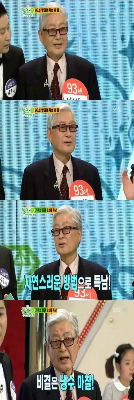 [스포츠투데이 조범자 기자]SBS '동안선발대회'에서 93세 서병욱 할아버지가 막내아들이 11세라는 사실을 밝혀 시청자들의 눈길을 끌었다.서병욱 할아버지는 4일오후 방송된 '동안선발대회'에 출연했다. 주름살 하나 없는 피부에 꼿꼿한 허리로 93세의 나이가 믿기지 않은 서 할아버지는 특히 막내아들 나이가 11세라고 밝혀 패널과 방청객을 깜짝 놀라게 했다.서 할아버지는 "인공수정이 아니라 자연적으로 얻은 아이"라며 "젊음을 유지한 비결은 냉수마찰"이라고 비법을 전했다.특히 서 할아버지는 늦은 나이에 아이를 낳은 이유에 대해 "69세에 33세 아들을 잃었다. 조상님 덕분에 내가 이렇게 살고 있는데 대를 끊으면 안된다는 생각에 계획을 해서 아들을 얻었다. 정말 기뻤다"고 말했다.한편 올해로 5회째를 맞는 SBS ‘동안선발대회’에는 신청자 3000여명 중 20여명이 본선에 올라 최고 동안을 가리며 이날 대상 수상자는 화장품 모델로 활동할 기회를 얻게 된다.스포츠투데이 조범자 기자 anju1015@<ⓒ아시아경제 & 재밌는 뉴스, 즐거운 하루 "스포츠투데이(stoo.com)">