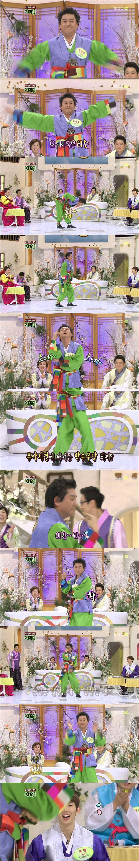 [스포츠투데이 최준용 기자]트로트계의 꽃 중년 가수 최영철이 조권의 ‘아브라카다브라’ 시건방 댄스를 선보이며 웃음을 선사했다. 5일 방송된 MBC 설특집 '세바퀴'에 ‘사랑이 뭐길래’로 많은 사랑을 받고 있는 최영철이 출연해 재치있는 입담과 개인기를 펼치며 주목받았다.이날 최영철은 자신의 히트곡 ‘사랑의 뭐길래’를 댄스버전으로 편곡해 열창했다. 이어 그는 2AM 조권의 개인기인 ‘아브라카다브라’의 시건방 댄스를 자신만의 색깔로 선보이며 출연진들에게 큰 웃음을 선사했다. 특히 최영철은 박수무당(?) 같은 한복에 흐느적거리는 특유의 댄스로 조형기로부터 “술 취한 것 아니냐”고 볼멘소리를 들었다. 한편 이날 장윤정, 박현빈, 윙크, 최영철, 씨스타(보라, 소유), 산이, 2AM(조권, 창민) 등이 출연해 재치있는 입담을 과시했다.스포츠투데이 최준용 기자 yjchoi01@<ⓒ아시아경제 & 재밌는 뉴스, 즐거운 하루 "스포츠투데이(stoo.com)">