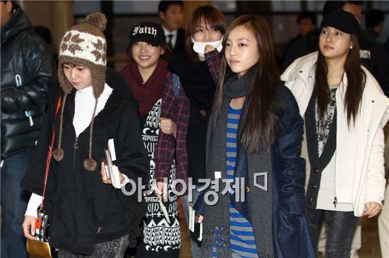 Girl group KARA departs for Japan from Seoul, South Korea on February 3, 2011 to resume filming for their Japanese TV series "URAKARA." The five-member girl band had halted their activities after members Han Seungyeon, Kang Jiyoung and Nicole announced they will split from their agency DSP Media.KARA [Lee Ki-bum/Asia Economic Daily]