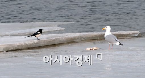 [아시아경제 이재문 기자]한파가 물러간 후 기온이 크게 올라간 7일 반포대교 주변에서 갈매기들이 조각난 얼음위에 먹이 다툼을 벌이고 있다.이재문 기자 moon@<ⓒ세계를 보는 창 경제를 보는 눈, 아시아경제(www.asiae.co.kr) 무단전재 배포금지>