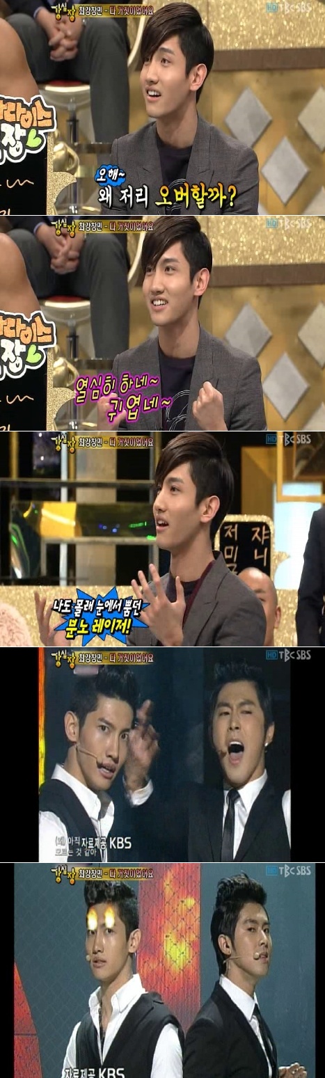 [스포츠투데이 조범자 기자]동방신기 최강창민이 SBS '강심장'에 출연해 까도남(까칠한 도시 남자) 매력과 예능감을 발산해 시청자들의 눈길을 사로잡았다.최근 '파라다이스 목장'과 '아테나:전쟁의 여신'을 통해 연기자로 데뷔한 최강창민은 8일 오후 '강심장'에 유노윤호와 함께 출연해 까칠하고 터프한 매력과 귀여운 막내의 모습, 솔직한 토크를 선보이며 방청객을 열광케 했다.최강창민은 "'왜'로 컴백했을 때 사람들이 눈에서 레이저나오겠다며 왜 저리 오버하나 하고 이상하게 봤다"며 "사실은 오랜만의 컴백이라 긴장감도 있었던 게 사실이지만 첫 방송 때 인이어 마이크가 내 실수로 들리지 않아 너무 스스로에게 화가 난 나머지 눈에서 분노의 레이저가 나왔다"고 고백해 웃음을 자아냈다.이어 최강창민은 "성격상 팬들에게 다정다감하게 하지 못하는 스타일이다. 팬들이 '잘생겼다'고 하면 어금니를 꽉 깨물고 '너만 그래, 너만!' 하고 윽박지르고 유노윤호가 하는 하트 사인을 하지도 못한다. 그래서 늘 어머니가 '아들아 제발 사인할 때 하트 좀 넣으라'고 한다"고 말해 또다시 웃음바다를 만들었다.최강창민은 또 유노윤호가 신발에 깔창을 깐다는 사실을 폭로하기도 하고, 유노윤호의 볼링장 '허세 세리머니'를 공개하기도 하며 예능감을 폭발해 시청자들의 뜨거운 관심을 모았다.한편 이날 '강심장'엔 '옴므파탈'을 주제로 자니윤, 동방신기, 공형진 등이 출연해 재치넘치는 입담을 선보였다.스포츠투데이 조범자 기자 anju1015@<ⓒ아시아경제 & 재밌는 뉴스, 즐거운 하루 "스포츠투데이(stoo.com)">