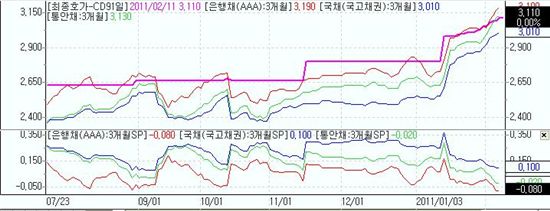 [표] CD91일물 은행채3개월 국고채3개월 통안채3개월 금리추이[제공 : 마켓포인트]