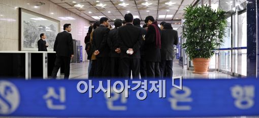 [아시아경제 이재문 기자]신한금융지주 차기 회장 선임을 위한 특별위원회가 열린 가운데 14일 오전 서울 신한은행 본사에서 취재진이 모여 대화를 나누고 있다.이재문 기자 moon@<ⓒ세계를 보는 창 경제를 보는 눈, 아시아경제(www.asiae.co.kr) 무단전재 배포금지>