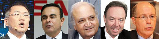 서울모터쇼 개막식에 참석할 예정인 주요 자동차 경영진들. 정의선 현대차 부회장, 카를로스 곤 르노-닛산 회장, 커슈브 마힌드라 회장, 이안 로버슨 BMW 총괄 사장, 팀 리 GM 사장(왼쪽부터).