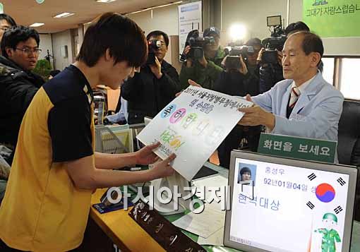 [아시아경제 윤동주 기자] 2011년도 첫 징병검사가 실시된 14일 서울 영등포구 서울지방병무청에 징병검사대상자가 1급 현역입영 통지서를 받고 있다. 병무청에 따르면 올해 징병검사대상자는 만 19세가 되는 1992년도 출생자와 이전 출생자 중 징병검사연기 사유가 해소된 자이며 이들은 지난해보다 1만 5000여명이 증가한 35만6000여명에 이른다.윤동주 기자 doso7@<ⓒ세계를 보는 창 경제를 보는 눈, 아시아경제(www.asiae.co.kr) 무단전재 배포금지>