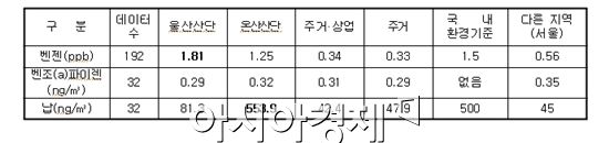 온산 산단지역의 납 평균농도도 ㎥당 0.55㎍로 국내 대기환경기준인 0.5㎍/㎥를 초과하는 것으로 조사됐다.폼알데하이드, 중금속 중에서는 비소와 카드뮴이 위해관리수준보다는 낮은 수준 이지만 일반 대기 수준보다는 높아 노출수준 저감, 배출량 저감대책 수립 등 우선 관심을 가져야 할 물질로 분석됐다.벤젠은 인체의 골수기능을 억제하는 범혈구감소증과 백혈병을 유발하는 물질로 알려져있다. 중급속 납은 피부나 점막에 자극을 줘 알레르기나 염증을 일으키가 호흡기 계통 질환의 원인을 제공한다.이번 조사는 국립환경과학원과 영남대 백성옥 교수님팀이 2009년 3월부터 1년간 공동으로 실시했다. 이들은 울산 산업단지와 인접 지역 5개 지점에서 계절별로 열흘간 대기중 농도를 측정하는 방식으로 이 같은 결과를 도출해 냈다.이에 따라 환경부는 벤젠 등 13종의 유해대기오염물질에 대해 측정망을 확대 운영할 계획이다.국립환경과학원에서는 위해성 기반의 유해오염물질 저감기본계획 수립 연구를 2011년에 추진할 예정이다. 또 주요 배출원에 대해서는 환경부와 함께 시설관리기준 마련 등 유해대기오염물질에 대한 관리를 대폭 강화해 나갈 계획이다.한편 환경부는 산업단지 지역의 환경오염이 주민건강에 미치는 영향을 파악해 예방관리대책을 마련하기 위해 2006년부터 울산, 사회반월, 구미, 여수 광양 등 전국 5개 주요 지역의 주민건강조사를 실시해오고 있다.김승미 기자 askme@<ⓒ세계를 보는 창 경제를 보는 눈, 아시아경제(www.asiae.co.kr) 무단전재 배포금지>