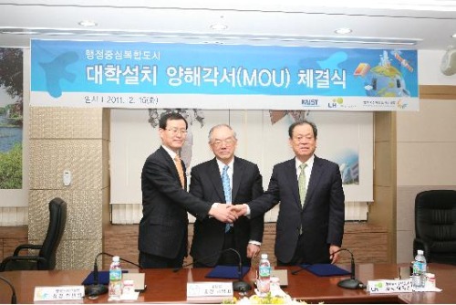 한만희 행정중심복합도시건설청장과 서남표 카이스트 총장(가운데), 이지송 한국토지주택공사 사장(맨 왼쪽)이 양해각서를 주고 받고 손을 맞잡고 있다.