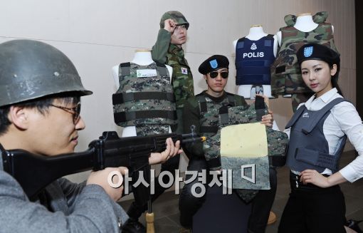 [아시아경제 이재문 기자]산업용섬유 전문기업 웰크론이 16일 오전 서울 여의도 63빌딩에서 첨단소재가 적용된 신형방탄복을 선보이고 있다. 이번에 선보인 제품은 방탄복 2종(수출형 및 내수용) 방검복 1종이며 이방탄복은 기존 방탄복에 비해 성능이 20% 개선됐다.이재문 기자 moon@<ⓒ세계를 보는 창 경제를 보는 눈, 아시아경제(www.asiae.co.kr) 무단전재 배포금지>