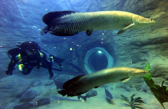 [아시아경제 이영철 기자] 지난해 말 문을 열고 20여일 무료입장하면서 주변 교통난까지 일으킨 국내 최대 동굴형 대전 ‘아쿠아월드’가 대전의 새 관광 명소로 떠오르고 있다.450여억원을 들여 대전시 중구 대사동 보문산 자연공원 대사지구에 1만9761㎡의 땅에 들어선 ‘아쿠아월드’는 지하 1층~지상 4층, 연면적 1만8708㎡ 크기다. 본관동 메인수족관(7581㎡)과 충무동 수족관(3197㎡)을 합친 전체담수량이 국내 최대다.아쿠아리스트가 피라루크에게 먹이를 주고 있다.