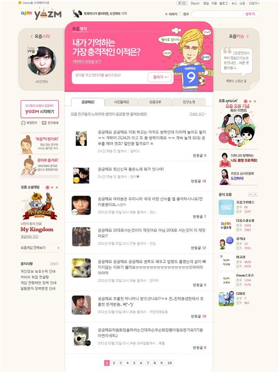 [아시아경제 김철현 기자]다음커뮤니케이션이 운영하는 소셜네트워크 서비스(SNS) '요즘()'이 서비스 시작 1년 만에 회원수 100만명을 넘어서며 새로운 커뮤니케이션 수단으로 주목 받고 있다.다음은 지난해 2월 오픈한 '요즘'이 오픈 9개월 만인 지난해 11월에 50만명 이용자를 확보했으며, 다시 3개월 만에 100만 이용자를 돌파했다고 17일 밝혔다.다음에 따르면 '요즘'은 150자의 짧은 글로 웹과 모바일 등을 통해 빠르고 가볍게 지인들과 이야기를 나눌 수 있는 SNS다. 특히 '요즘'은 50만 이용자를 돌파한 지난 11월과 비교했을 때 순방문자(UV)는 100% 증가하고, 페이지뷰(PV)는 30% 증가하는 등 빠른 성장세를 보이고 있다. 사용자 참여를 알 수 있는 게시 글 수는 140% 증가했다.다음 측은 '요즘'이 나이, 성별, 혈액형, 취미, 관심사 등 다양한 정보를 통해 자신을 표현하고, 같은 관심사를 가진 친구를 쉽게 찾을 수 있도록 하는 등 다른 SNS와 차별화된 기능으로 네티즌들을 공략했다고 설명했다. 동영상과 이미지를 별도의 페이지에 가지 않고도 바로 즐길 수 있는 강력한 멀티미디어 기능도 사용자들의 호응을 얻었다. 지난해 7월부터 국내·외 소셜게임을 본격적으로 도입한 것도 장점이다.다음 신종섭 SNS·동영상 본부장은 "요즘은 기존의 SNS와 다른 색다른 즐거움을 느낄 수 있는 국내 대표 SNS로 빠르게 성장해왔다"며 "앞으로 이용자들이 더욱 자유롭고 재미있게 즐길 수 있도록 다양한 서비스를 제공하는 동시에 지속적인 업데이트를 통해 한국형 SNS로 발전시켜나갈 것"이라고 밝혔다.