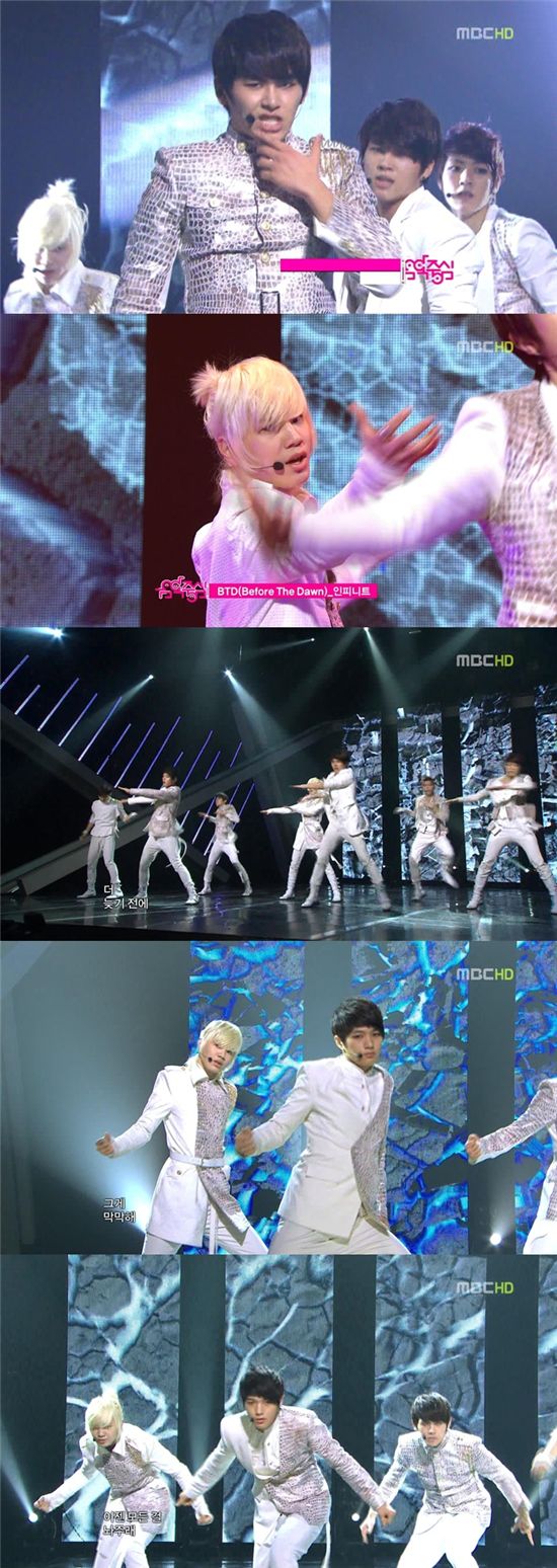 [스포츠투데이 최준용 기자]7인조 보이그룹 인피니트가 환상적인 군무로 댄스의 진면목을 보여줬다.인피니트는 19일 생방송으로 진행된 MBC '쇼!음악중심'에 출연해 두 번째 미니앨범 '에볼루션(EVOLUTION)'의 타이틀 곡 'B.T.D'를 공개했다.이날 무대에서 인피니트 멤버들은 파격적인 머리 염색과 강렬한 무대의상으로 한층 성숙한 분위기를 보여줬다. 아울러 1집 때와는 다른 파워풀한 보컬과 강렬한 안무로 순수한 소년에서 거친 남자로의 변신에 성공했다.여기에 인피니트는 한달 동안 피땀 흘려 연습했다는 전갈춤을 완벽하게 소화해냈다. 이날 인피니트는 한 치에 어긋나지 않은 완벽한 대형과 동작으로 군무 아이돌의 진면목을 보여줬다.이번 음반 타이틀곡 'B.T.D'는 '비포 더 던(BEFORE THE DAWN)'의 약자로 카라의 '미스터', '프리티걸' 레인보우의 'A' 등을 작업한 한재호-김승수 콤비가 심혈을 기울인 곡이다.또 여심을 뒤흔들 가사와 함께 어쿠스틱 악기와 전자악기가 하나로 믹스된 사운드가 어우러져, 비장함과 드라마틱한 느낌의 정점을 표현해냈다.인피니트의 이번 음반에는 타이틀 곡 'B.T.D'외에도 '인트로'와 감성적 인 팝 댄스 넘버 '캔 유 스마일(CAN U SMILE)', 강렬한 리듬이 인상적인 'Hysterie' , 엠씨 더 맥스의 제이윤이 작곡한 명품 발라드 '마음으로.. (Voice of my heart)', 마지막 트랙 '몰라' 등 총 6곡이 수록돼 있다.스포츠투데이 최준용 기자 yjchoi01@<ⓒ아시아경제 & 재밌는 뉴스, 즐거운 하루 "스포츠투데이(stoo.com)">