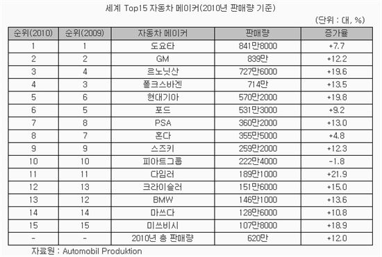 [아시아경제 이창환 기자] 지난해 전세계에서 자동차를 가장 많이 판 회사는 도요타인 것으로 나타났다. 제너럴모터스(GM)이 뒤를 이었고 르노닛산과 폴크스바겐, 현대기아차 등이 뒤를 이었다.20일 독일의 자동차 전문지 AP와 함부르크 코리아비즈니스센터 등에 따르면 일본의 자동차 회사 도요타는 지난해 전세계에서 841만8000대의 자동차를 팔아 2009년에 이어 2년 연속 세계 판매 1위를 지켰다. 전년 대비 차량 판매는 7.7% 증가했다.같은 기간 GM은 전년 대비 12.2% 증가한 839만대를 팔아 근소한 차이로 2위를 지켰다. 도요타는 리콜사태라는 악재가 있었음에도 2009년에 이어 세계 자동차 메이커 1위 자리를 지켰다. 2위 GM은 중국과 미국시장에서 판매호조를 보여 도요타와의 판매량 격차를 3만 대 이하로 줄였다.도요타와 GM이 2년 연속 같은 자리를 지킨데 비해 다른 상위권 자동차 회사들은 눈에 띄는 순위 변동이 나타났다.우선 르노닛산 자동차가 폴크스바겐을 제치고 2009년 4위에서 3위로 올라섰다. 또 현대기아차도 포드자동차를 제치고 6위에서 5위로 한 단계 점프했으며 푸조시트로앵 자동차그룹도 혼다자동차를 제치고 8위에서 7위로 뛰어 올랐다.판매 상위권에 있는 회사들 대다수가 경기 회복에 힘입어 차량 판매량이 증가했다. 특히 벤츠를 만드는 독일의 다임러 그룹은 2009년 대비 21.9% 증가한 판매 수치를 보여 고급차에 대한 수요가 증가하고 있음을 보여줬다.반면 이탈리아의 피아트자동차는 판매대수가 오히려 1.8% 감소하는 모습을 보여 세계 자동차 판매 상위 15위 회사 중 유일하게 판매대수가 줄었다.이창환 기자 goldfish@<ⓒ세계를 보는 창 경제를 보는 눈, 아시아경제(www.asiae.co.kr) 무단전재 배포금지>