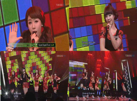 [스포츠투데이 전성호 기자]6인조 신예 걸그룹 달샤벳(비키, 세리, 아영, 지율, 가은, 수빈)이 여성스러운 무대의상과 깜찍한 엉덩이춤을 뽐냈다.달샤벳은 20일 생방송으로 진행된 SBS '인기가요'에 출연해 데뷔곡 '수파 두파 디바(Supa Dupa Diva)' 무대를 선보였다. 이날 무대에서 달샤벳 멤버들은 신인답지 않은 여유넘치는 안무와 보컬을 보여주며 특유의 깜찍함과 상큼함을 발산했다.특히 달샤벳 멤버들은 깜찍함과 섹시함이 공존하는 블랙+레드 계열의 화려한 무대 의상으로 여성미를 뽐냈다. 귀여움이 돋보이는 '엉덩이춤' 역시 남성팬들의 시선을 사로잡았다.달샤벳의 타이틀 곡 '수파 두파 디바(Supa Dupa Diva)'는 가요계 최고의 디바를 꿈꾸는 달샤벳 멤버들의 포부가 담겨있는 노래로, 작곡가 이트라 이브(E-TRIBE)만의 트렌디하고 세련된 멜로디가 특징이다.스포츠투데이 전성호 기자 spree8@<ⓒ아시아경제 & 재밌는 뉴스, 즐거운 하루 "스포츠투데이(stoo.com)">