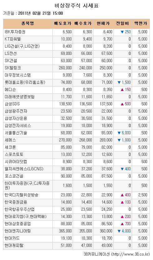 [아시아경제 천우진 기자]장외주식 시장이 이틀 만에 다시 하락했다.IPO(기업공개) 관련 주로 오는 23일 공모 청약 예정인 인쇄회로기판 동박 개발 공급업체 일진머티리얼은 1만7250원(-2.82%)으로 내렸다. 상장심사 청구 기업으로 골프 시뮬레이터 사업체 골프존은 10만3500원(-3.72%)으로 3일 연속 하락했다. 창고 자동화 시스템업체 신흥기계 역시 6300원(-1.56%)으로 약세를 보였다. 반면 상장 승인기업인 한국디지털위성방송은 2만2900원(+1.78%)으로 상승세를 기록했다.범 현대 계열 관련 주로는 조선업체 현대삼호중공업이 8만6500원(+0.82%)으로 올라 5주 최고가를 경신했다. 종합물류기업 현대로지엠은 1만3800원(+1.47%)으로 상승하며 7일 간의 약세를 벗어났다. 그러나 토목엔지니어링 서비스업체 현대엔지니어링은 36만원(-1.10%)으로 5일 연속 하락했다.삼성 관련 주로는 ICT(정보통신기술) 서비스기업 삼성SDS와 초음파 진단기 전문업체 메디슨이 각각 13만7500원(+0.36%), 8350원(+1.83%)으로 상승했다. 반도체 세정장비업체 세메스와 홈네트워크 전문기업 서울통신기술은 각각 26만9000원(-0.37%), 6만5000원(-8.45%)으로 하락세를 나타냈다.금융 관련 주로는 증권담보 대출업체 한국증권금융이 1만4600원(+0.69%)으로 올랐으나 증권사 IBK투자증권과 솔로몬투자증권은 각각 6400원(-3.76%), 4400원(-4.35%)으로 하락했다.그 밖에 비금속 광물제품 제조업체 사파이어테크놀로지는 5만5500원(+1.37%)으로 19일 만에 반등했다. 반면 LCD장비업체 아이씨디와 영사기 및 관련 장비업체 엠씨넥스는 각각 1만4400원(-0.69%), 9600원(-1.54%)으로 하락하며 장을 마감했다.