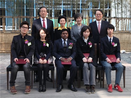 [아시아경제 신범수 기자]아산사회복지재단(이사장 정몽준, 사진 뒷줄 맨 왼쪽)은 24일 오후 서울 송파구 아산교육연구관에서 2011년도 아산장학생 장학증서 수여식을 개최했다.수여식에서 재단 측은 전국에서 추천 받은 고등학생 및 대학ㆍ대학원생 총 877명에게 장학금 35억원을 전달했다. 특히 올해부터는 봉사활동 문화를 확산시키려는 취지에서 자신의 전공지식을 이웃과 나누고 있는 '봉사장학생'을 선정하기로 하고, 첫 수상자로 대학생 30명에게 장학금을 지급했다. 이로써 아산재단은 1977년 이후 34년간 총 2만 1000여명의 학생에게 장학금 약 280억원을 지원했다. 신범수 기자 answer@<ⓒ세계를 보는 창 경제를 보는 눈, 아시아경제(www.asiae.co.kr) 무단전재 배포금지>