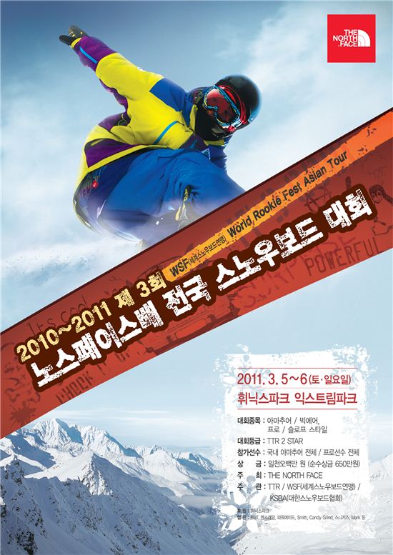 [아시아경제 박소연 기자]아웃도어 브랜드 노스페이스는 노스페이스배 스노우보드 대회를 오는 3월 5~6일 휘닉스파크에서 개최한다고 28일 밝혔다. 이번 대회는 노스페이스 단독 주최인 월드루키페스트와 프로와 아마추어 보드 대회가 함께 진행된다. 올해로 세 번째인 노스페이스배 월드루키페스트(WRF)는 만 18세 이하의 아시아 지역의 루키 선발전이다. 슬로프 스타일로 진행되며, 우승자에게는 2011년 4월 6일부터 10일까지 오스트리아 이시클에서 개최되는 TTR 4스타 대회인 프로테스트 월드 루키 파이널(Protest World Rookie Finals)의 출전 자격과 항공권 일체를 지급 받는다. 이와 함께 노스페이스컵 프로스노우보드 선수권대회는 남자 슬로프 스타일(Slope Style, S/S) 여자의 경우 빅에어(Big Air, B/A) 종목으로 개최된다. 총 상금 560만원과 트로피, 상장이 수여 되며, 협회의 모든 프로 선수들이 출전 할 수 있다. 아마추어 스노우보드대회는 남녀 모두 빅에어(Big Air, B/A) 종목이다. 남녀 각 1, 2, 3등에게는 노스페이스의 고급 자켓이 시상품으로 주어지며, 기타 성적에 따른 부상과 협회의 프로선수로 등록자격, 상장과 트로피를 받을 수 있다. 선착순 80명만 출전 할 수 있다. 이번 대회는 노스페이스가 주최하며 사단법인 대한스노우보드협회(KSBA), 세계스노우보드연맹(WSF)과 TTR이 주관하며, 휘닉스파크, EXIT, SMITH, Mark, 멘소래담이 후원한다. 대회의 참가 신청은 대한스노우보드협회(KSBA) 공지사항의 신청서를 다운로드 받은 후 2011년 3월 4일 까지 ksba.competition@gmail.com으로 신청하면 된다. 현장접수는 3월 5일 오전 11시부터 오후 6시까지 휘닉스파크 유스호스텔 2층의 대회운영본부에서 접수 받을 예정이다.박소연 기자 muse@<ⓒ세계를 보는 창 경제를 보는 눈, 아시아경제(www.asiae.co.kr) 무단전재 배포금지>