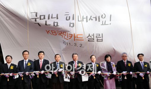 [아시아경제 이재문 기자]2일 오전 서울 내수동 KB국민카드빌딩에서 열린 설립기념식에서 어윤대 KB금융지주 회장과 최기의 KB국민카드 사장을 비롯한 참석자들이 테이프 커팅을 하고 있다.이재문 기자 moon@<ⓒ세계를 보는 창 경제를 보는 눈, 아시아경제(www.asiae.co.kr) 무단전재 배포금지>이재문 기자 moon@<ⓒ아시아 대표 석간 '아시아경제' (www.newsva.co.kr) 무단전재 배포금지>