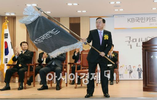 [아시아경제 이재문 기자]2일 오전 서울 내수동 KB국민카드빌딩에서 열린 설립기념식에서 최기의 KB국민카드 사장이 사기를 흔들고 있다.이재문 기자 moon@<ⓒ세계를 보는 창 경제를 보는 눈, 아시아경제(www.asiae.co.kr) 무단전재 배포금지>이재문 기자 moon@<ⓒ아시아 대표 석간 '아시아경제' (www.newsva.co.kr) 무단전재 배포금지>