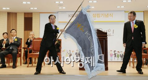 [아시아경제 이재문 기자]2일 오전 서울 내수동 KB국민카드빌딩에서 열린 설립기념식에서 최기의 KB국민카드 사장이 사기를 흔들고 있다.이재문 기자 moon@<ⓒ세계를 보는 창 경제를 보는 눈, 아시아경제(www.asiae.co.kr) 무단전재 배포금지>이재문 기자 moon@<ⓒ아시아 대표 석간 '아시아경제' (www.newsva.co.kr) 무단전재 배포금지>