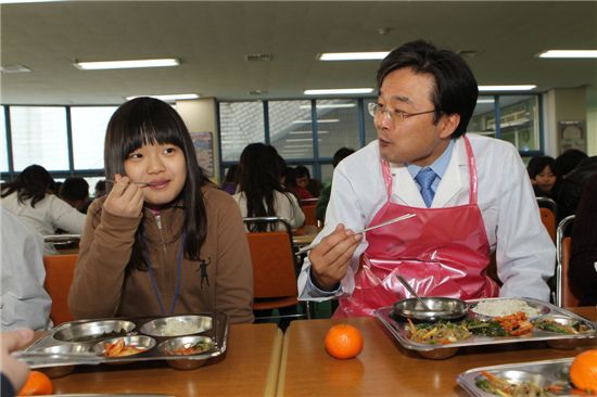 김우영 은평구청장이 3일 수색초등학교에서 무상급식 배식을 한 후 어린이와 함께 점심 식사를 하고 있다.