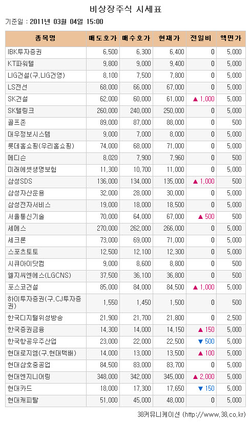 [아시아경제 천우진 기자]장외주식 시장이 소폭 상승했다.IPO(기업공개) 관련 주로 코스피 상장예비심사 청구서를 제출한 패션의류 업체 엠케이트렌드가 9000원(+15.38%)으로 급등했다. 의료용 기기 제조업체 씨유메디칼시스템은 1만2850원(-1.91%)으로 하락했다. 신발 도소매 업체 에이비씨마트코리아는 1만5500원(-0.64%)으로 소폭 내렸다.삼성 관련 주로 ICT(정보통신기술) 서비스기업 삼성SDS가 13만5000원(+0.75%), 홈네트워크 전문업체 서울통신기술이 6만7000원(+0.75%)으로 두 종목 모두 동일한 상승률을 보였다. 초음파 진단기 전문기업 메디슨은 보합권에 머물렀다.범 현대 관련 주로 토목엔지니어링 서비스기업 현대엔지니어링과 현대그룹 종합물류기업 현대로지엠이 각각 34만5000원(+0.58%)과 1만3500원(+0.75%)으로 반등했다. 전업카드사 현대카드는 1만7650원(-0.84%)으로 떨어졌다.반도체 관련 주로 LCD장비 및 반도체 장비 제조업체 아이씨디는 1만7950원(+6.21%)으로 상승폭을 확대했다. 반도체 제조용 기계 제조업체 테크윙이 1만3800원(+0.73%)으로 전일의 오름세를 지속했으나 연성인쇄회로판 제조업체 에스아이플렉스는 6150원(-3.91%)으로 내려 5주 최저가를 기록했다.금융 관련 주로 증권담보대출 및 증권관련 예금수탁 서비스업체 한국증권금융이 1만4150원(+1.07%)으로 올랐고 할부금융 서비스업체 우리캐피탈이 2850원(+3.64%)으로 상승했다.사파이어 단결정 제품 생산업체 사파이어테크놀로지는 견조한 모습을 나타내며 6만2000원(+2.06%)을 기록했다. 건설업체 포스코건설과 SK건설은 각각 8만4500원(+1.20%)과 6만1000원(+1.67%)으로 오르며 장을 마감했다.