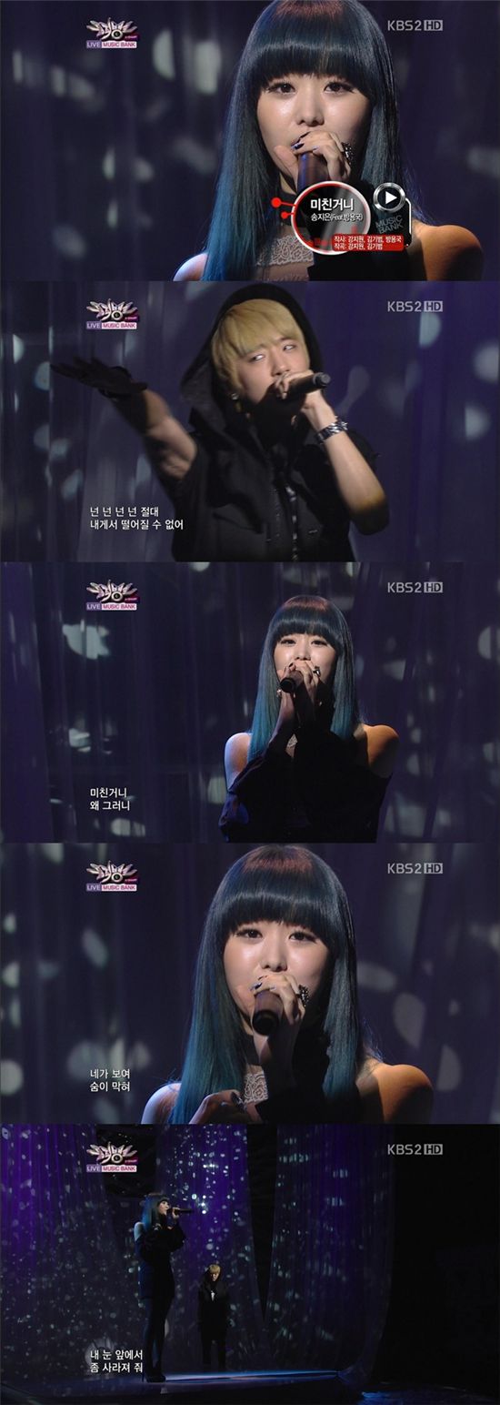 [스포츠투데이 최준용 기자]걸그룹 시크릿의 메인보컬 송지은이 환상적인 기량과 과감한 이미지 변신으로 화려한 컴백 무대를 선사했다.송지은은 4일 생방송으로 진행된 KBS2 '뮤직뱅크'에 출연해 두 번째 솔로앨범 타이틀 곡 ‘미친거니’를 공개했다.이날 송지은은 그동안 그룹 활동에서 보여준 발랄한 모습에서 녹색 머리로 과감한 이미지 변신을 시도했다. 그는 Hip-Hop 장르와의 만남을 통해 한 층 감성 깊은 보컬을 선보이며 솔로 보컬리스트로서의 역량을 과시했다.특히 송지은은 감미로운 피아노 선율과 잘어우러진 호소력 짙은 보이스를 선보였다. 또 신예 래퍼 방용국이 지원사격하며 무대의 완성도를 높였다.타이틀 곡 '미친거니'는 작곡가 강지원, 김기범이 프로듀싱에 참여했으며 피아노 선율이 인상적인 R&B 힙합 장르의 곡이다. 송지은의 애절한 보컬에 신예 래퍼 방용국의 묵직한 랩이 인상적이라는 평이다. 한편 송지은의 이번 타이틀 곡 ‘미친거니’는 발매하자마자 각종 온라인 음악 사이트 실시간 음원 차트 1위에 오르며 벌써부터 히트조짐을 보이고 있다.스포츠투데이 최준용 기자 yjchoi01@<ⓒ아시아경제 & 재밌는 뉴스, 즐거운 하루 "스포츠투데이(stoo.com)">