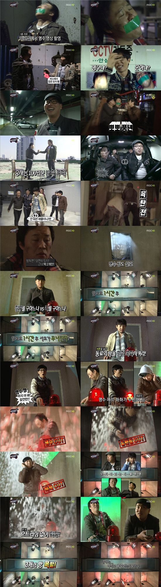 [스포츠투데이 최준용 기자]5일 방송된 MBC '무한도전'에서는 박명수와 정준하 둘 중에 한명을 구해야 하는 심리게임 ‘사생결단’ 특집이 그려졌다.이날 무한도전 멤버들에게 박명수, 정준하 중 오직 한 명만을 구할 수 있다는 섬뜩한 메시지가 전송되면서 시작됐다. 정준하와 박명수는 각각 서울 충무로에 위치한 진양상가 1동과 2동 지하에 갇혀 있었다. 입은 테이프로 막혀 있었고 몸에는 폭탄이 묶여 있어 긴박감을 조성했다.처음 멤버들은 우리가 왜 박명수와 정준하를 구해야 하냐고 반문하면서 대수롭지 않은 반응을 보였다. 하지만 이내 멤버들은 각자의 교통편으로 두 멤버들을 구하러 갔다.한낮, 도심 한복판에서 난데없는 구출작전을 펼치게 된 다섯 멤버들은 두 사람과의 소소한 추억들을 되짚어 보기도 하고 시민들의 의견을 묻기도 하는 등, 과연 누구를 구해야 할 지 괴로워했다. 박명수를 선택한 시민들은 “처자식이 있다” “불쌍하다”라는 이유를 들었다. 또 정준하를 선택한 시민들은 “아직 결혼을 하지 못했다” “혼자 살아남을 수 없을 것 같다”라고 밝혀 눈길을 끌었다.하지만 이날 미션에는 반전이 있었다. 앞서 정준하와 박명수는 멤버들 몰래 갇혀있는 장소를 서로 맞바꿨다. 바뀐 장소에 어떤 멤버가 많이 구하러 오는지 헤아려 이를 내기에 반영하기 위한 것이었다. 이날 승자는 밥차 100인분 쾌척해야 했다.노홍철과 유재석은 박명수를 선택, 그가 갇혀있는 방으로 향했지만 거기에는 정준하가 있었다. 자신을 선택하지 않았다며 아쉬운 소리를 내뱉는 정준하에게 노홍철과 유재석은 미안함에 고개를 들지 못했다.반면 길, 하하, 정형돈은 정준하를 선택, 마찬가지로 그가 갇혀있는 방으로 향했다. 정준하 대신 박명수가 갇혀있는 것을 발견한 세사람은 당황한 표정을 감추지 못했다. 섭섭함에 몸부림치는 박명수에게 이들은 볼뽀뽀를 선사하며 그의 마음을 달랬다.이후 이들에게는 구출의 기쁨이 아닌 또 다른 고난의 시작됐다. 이들은 각자 인원보다 적게 배치된 방독면을 놓고 화생방 가스가 나오는 방에 갇혀 각자의 우정을 시험하게 됐다.약 6년째 동고동락 하며 친형제와 같은 우애를 과시했지만 극한의 상황에 몰리자 이들은 조금씩 무한 이기주의의 본성을 드러냈다.아울러 이들은 한시간 안에 무너진다는 세트 독방에 갇혀 또 다른 우정을 시험했다. 자신이 살기 위해서 다른 동료를 제거해야 되는 상황에 처했다. 결국 서로를 믿지 못한 박명수와 유재석 하하가 첫 번째로 탈락했다. 이후 동료를 제거하기 위해 버튼을 누르면 도리어 자신이 제거된다는 사실을 안 노홍철은 특유의 사기행각을 펼쳤다. 결국 이 사실을 모른 정형돈은 노홍철의 희생양이 됐다.정준하, 노홍철, 길 3명이 살아남은 상황에 마지막까지 긴박감 넘치는 심리게임이 펼져쳤다. 결국 버튼에 연결된 라인을 제거 한 채 사기행각을 벌이던 노홍철은 인과응보의 결말을 맞았다. 이어 길과 정준하도 종료를 남긴 시점에서 버튼을 누르며 비참한 최후를 맞았다. 결국 무한도전 멤버들은 모두 서로를 믿지 못한 채 제거되는 상황으로 결말을 맺었다.이날 무한도전에서는 인간들 내면에 숨겨진 '이기주의'에 대한 경각심을 일깨우며 우정에 대해 다시 한번 생각해 보는 시간을 가졌다.스포츠투데이 최준용 기자 yjchoi01@<ⓒ아시아경제 & 재밌는 뉴스, 즐거운 하루 "스포츠투데이(stoo.com)">