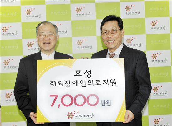 ▲조현택 효성 지원본부 사장이 10일 푸르메재단 강지원 공동대표에게 지원금을 전달하고 있다.